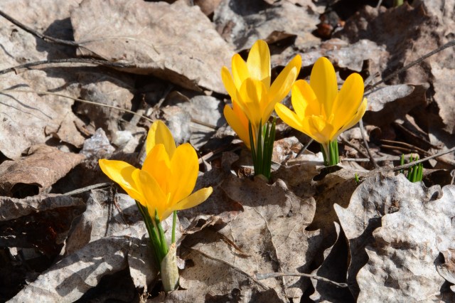 Pikkukrookus puskee lehtien alta