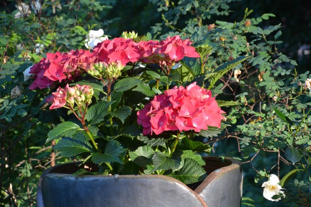 Jalohortensia ja vähän juhannusruusujakin