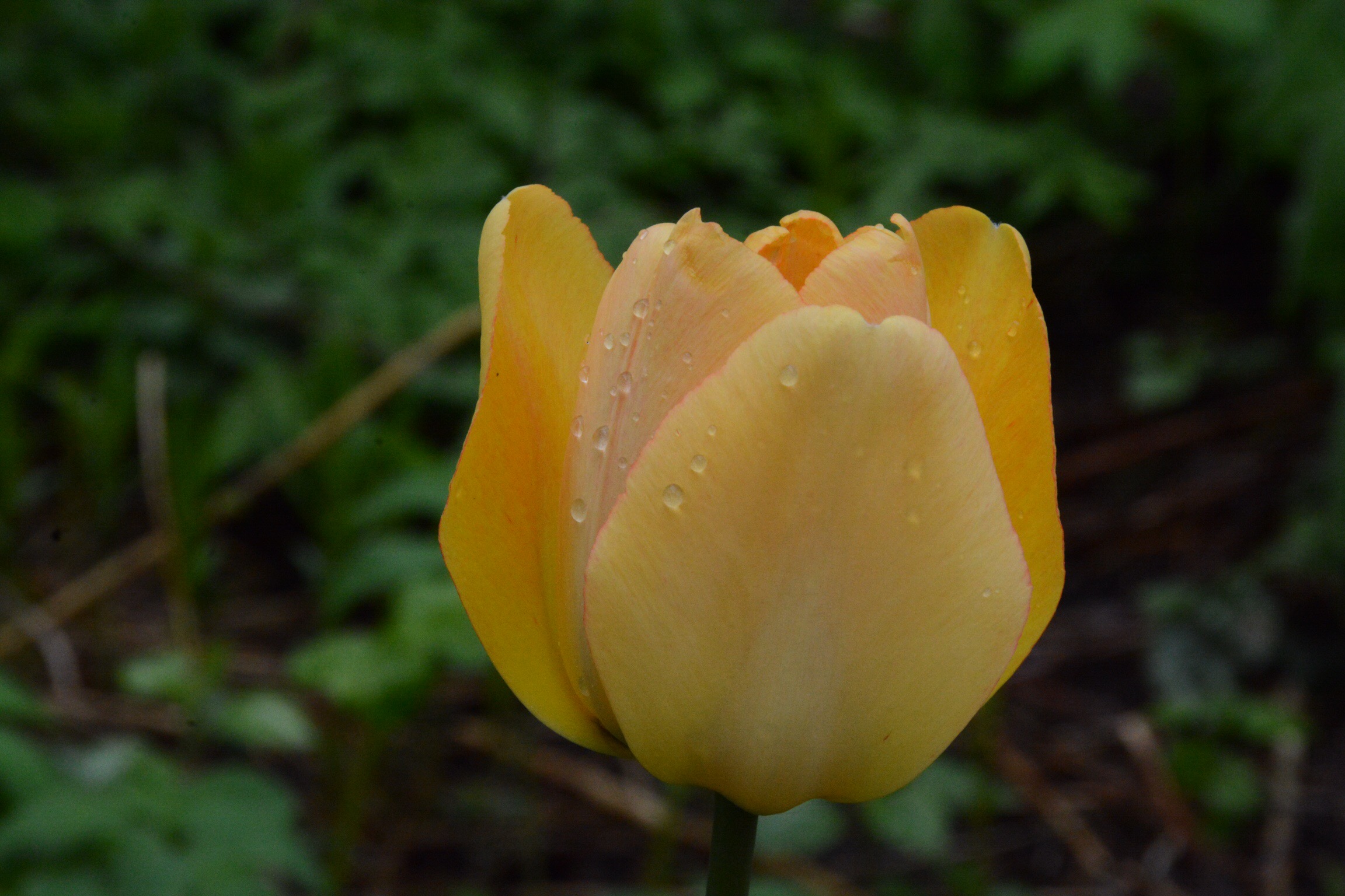 Keltatulppaani sateen jälkeen