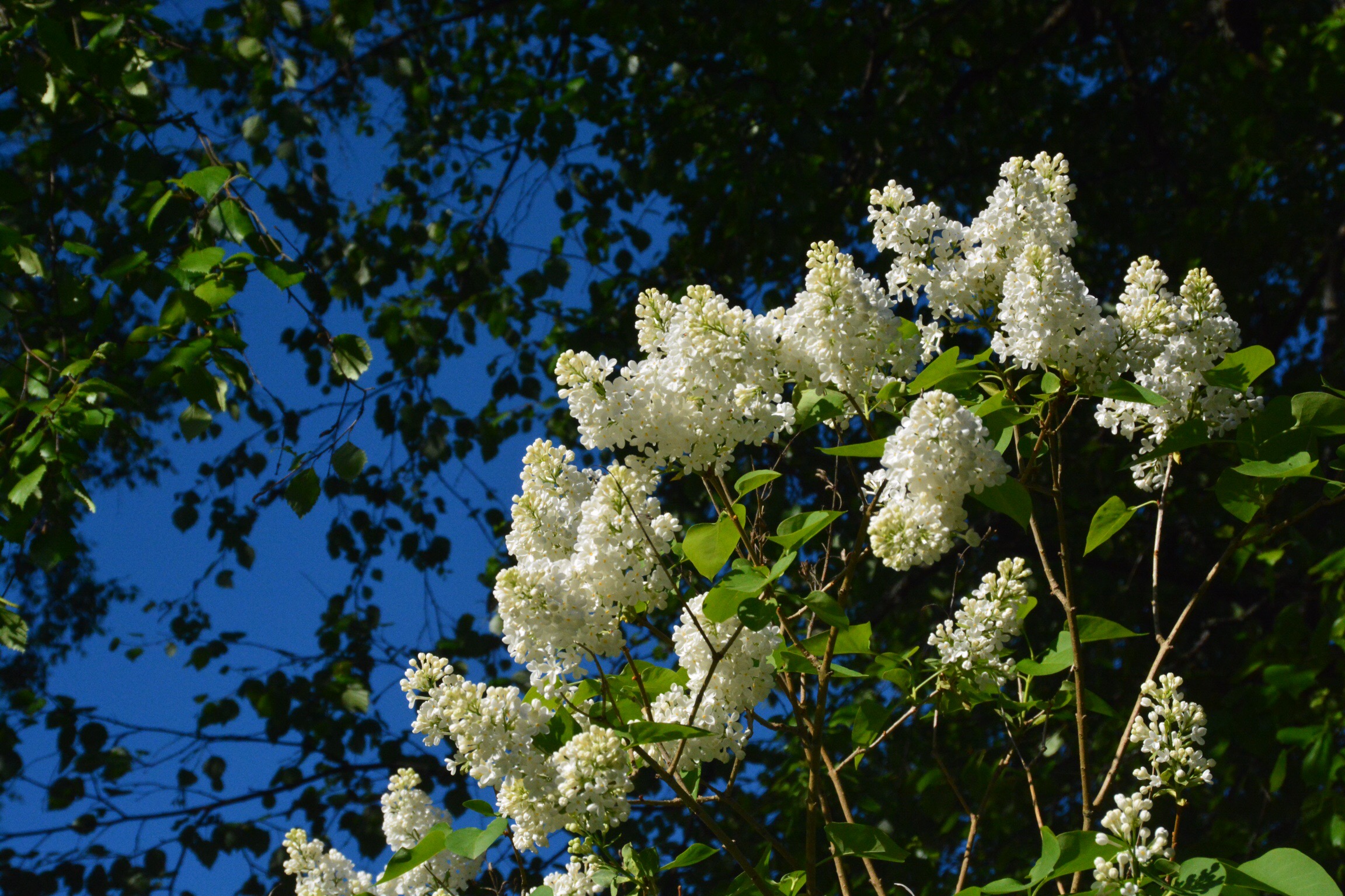 Valkoinen syreeni, sinitaivas, vihreä koivu