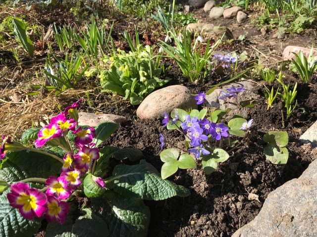 Esikkoa, sinivuokkoa, valkovuokkoa, ja uutta versoa