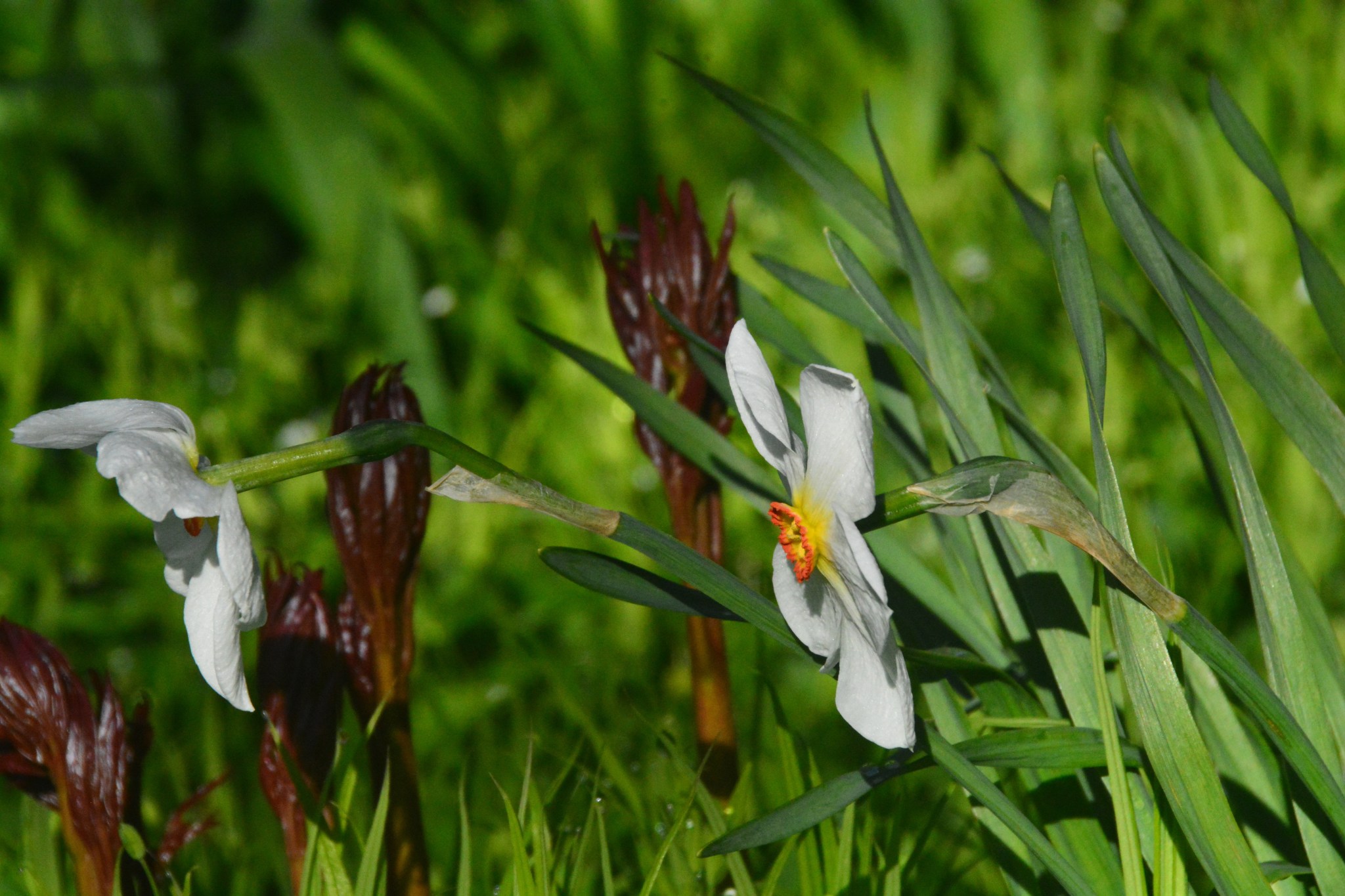 Helluntainarsissin takana pionit kehittyy